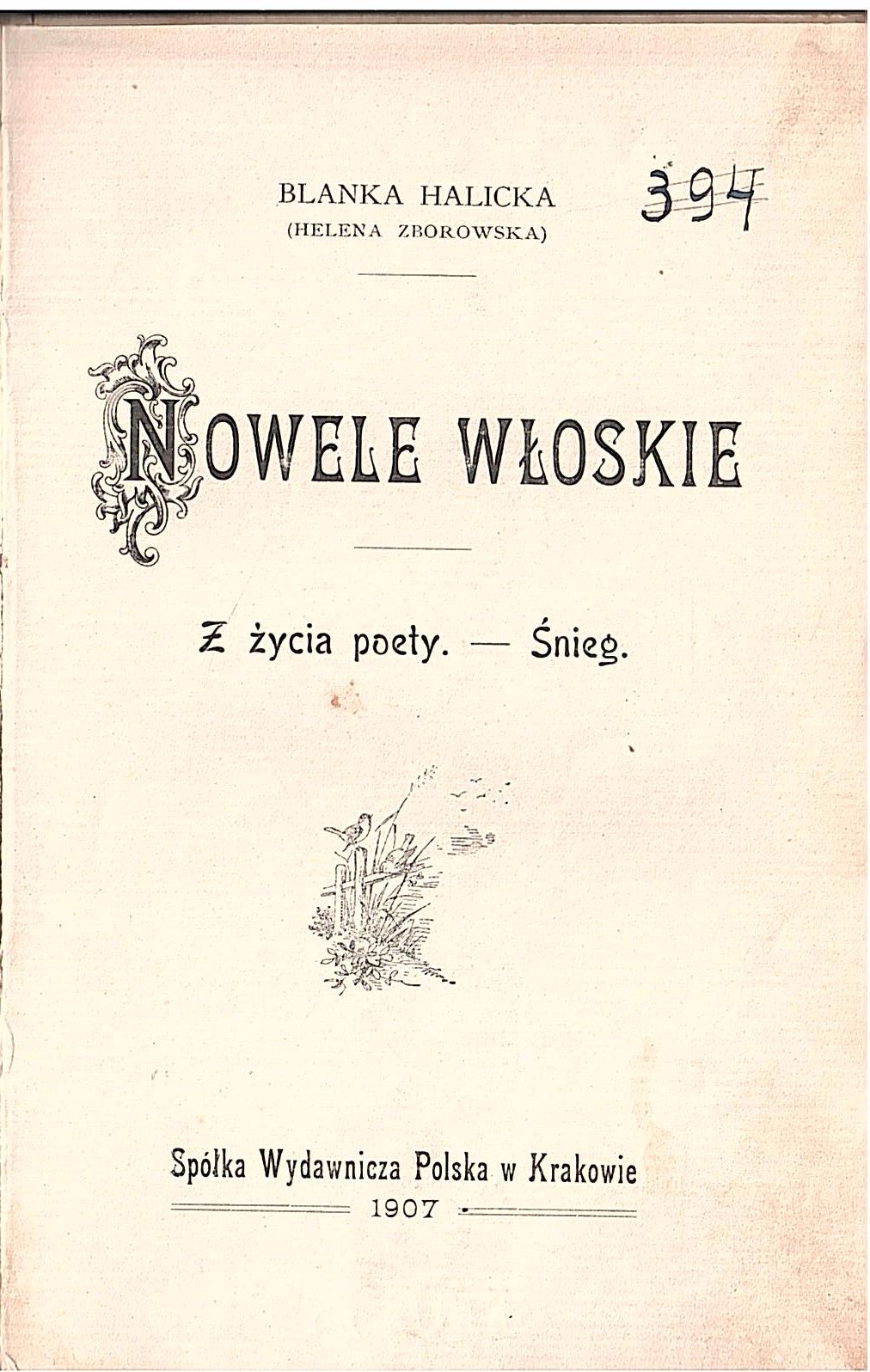 Nowele włoskie ; Z życia poety ; Śnieg / Blanka Halicka. - Kraków : Spółka Wydawnicza Polska, 1907 (Kraków: Drukarnia "Czasu" pod zarządem A. Świerzyńskiego). - 133, [2] strony ; 23 cm.