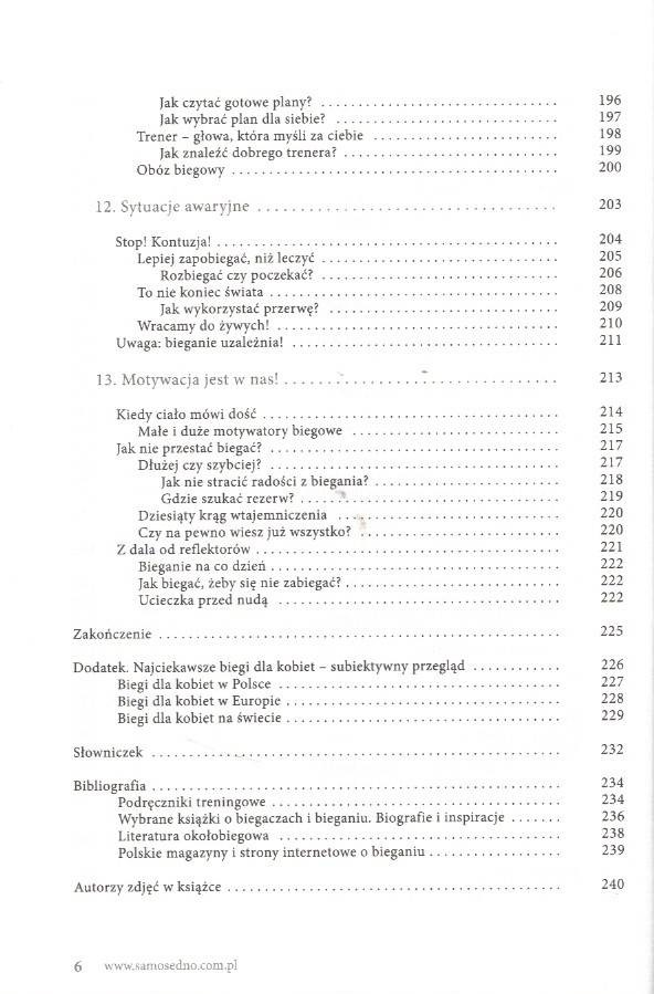 Każda z nas ma własny powód, aby pod wpływem impulsu, w pogodę lub niepogodę, włożyć wygodne buty i pobiec. Chcemy odzyskać formę i zgrabną sylwetkę, poczuć radość i pozytywne emocje z każdym pokonanym kilometrem. "Bieganie. Kobieca strona mocy" to poradnik dla kobiet, które potrafią być bohaterkami, dla których nie ma ograniczeń. Autorka, która ma dziś na koncie kilkaset imprez biegowych w kraju i za granicą, zarazi cię swoim optymizmem i pasją. Książka przedstawia najprostsze i najpopularniejsze metody rozpoczynania biegania oraz ćwiczenia rozgrzewające. Podpowiada, jak funkcjonować w biegowym świecie, co zrobić, gdy pojawi się kontuzja. Pomoże również wybrać odpowiednie obuwie i strój, w którym poczujesz się komfortowo i kobieco, oraz przydatne gadżety i aplikację sportową. Dowiesz się, jak czerpać radość z biegania i co robić, aby podtrzymać swoją motywację! Dzięki poradnikowi: - zaczniesz biegać i odkryjesz uzależniające działanie endorfin, które wpłyną na lepsze samopoczucie - zaplanujesz indywidualny trening i dowiesz się, kiedy warto zwrócić się o pomoc do profesjonalnego trenera - poprawisz kondycję, zaczniesz zdrowo się odżywiać, zrzucisz zbędne kilogramy i wzmocnisz samokontrolę - podtrzymasz swoją motywację i nie poddasz się w chwilach zwątpienia - przygotujesz się do udziału w zawodach sportowych, maratonach i ultramaratonach.