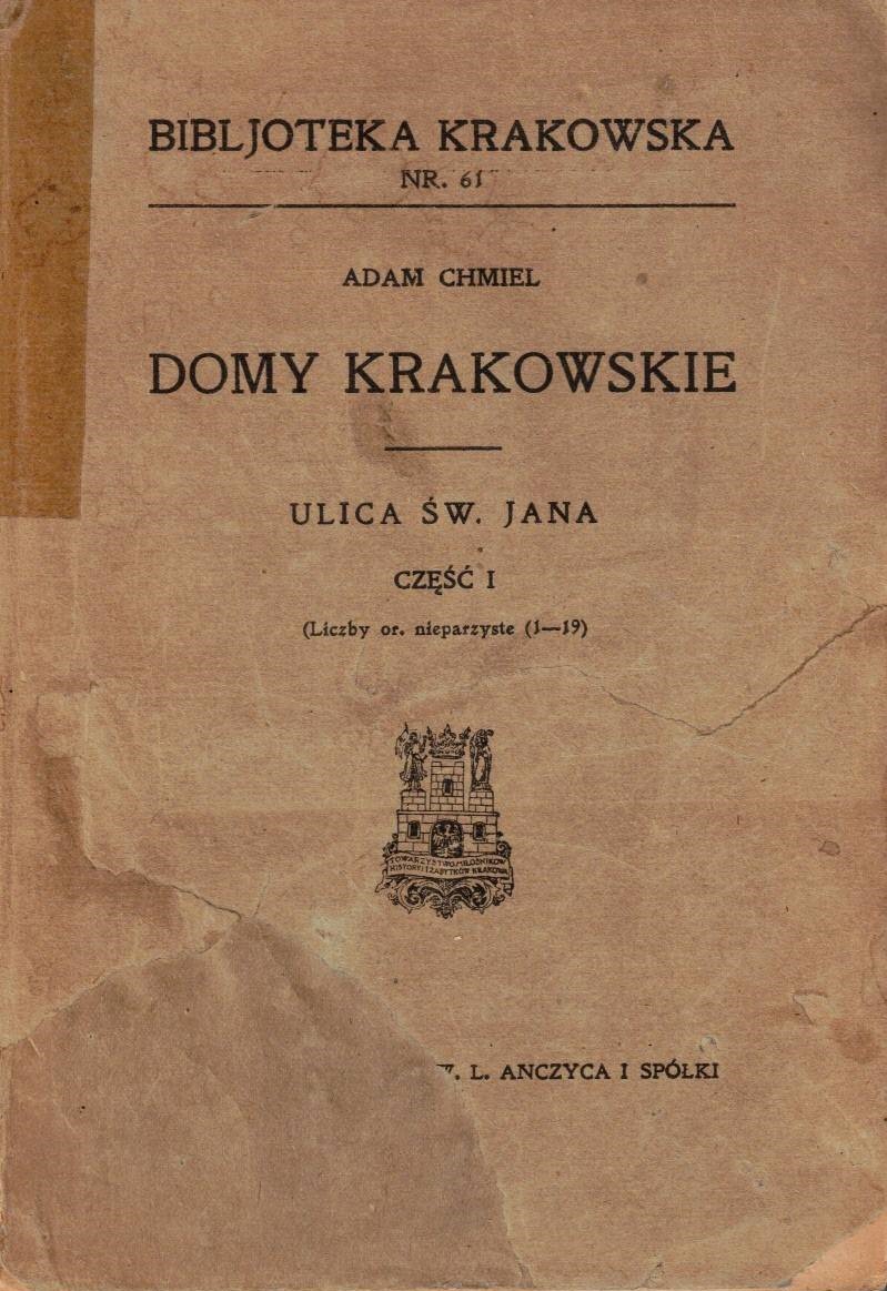 Domy krakowskie : ulica św. Jana. Cz. 1, Liczby or. nieparzyste (1-19) / Adam Chmiel. - Kraków : Towarzystwo Miłośników Historyi i Zabytków Krakowa, 1924 (Kraków : W. L. Anczyc). - 112 stron, [12] stron tablic, [7] kart tablic (wiekszość złożona) : ilustracje ; 20 cm.