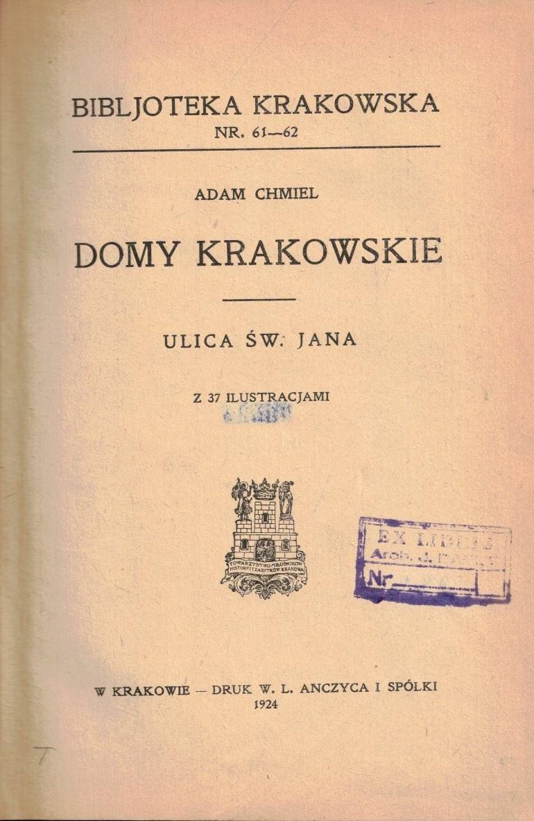 Domy krakowskie : ulica św. Jana. Cz. 2, Liczby or. parzyste (2-32) / Adam Chmiel. - Kraków : Towarzystwo Miłośników Historyi i Zabytków Krakowa, 1924 (Kraków : W. L. Anczyc). - Stron [3], 114-312, [18] stron tablic : ilustracje ; 21 cm.