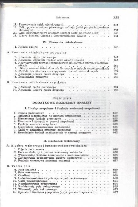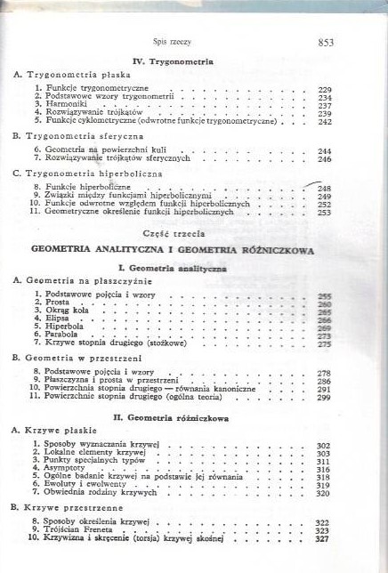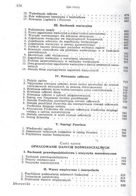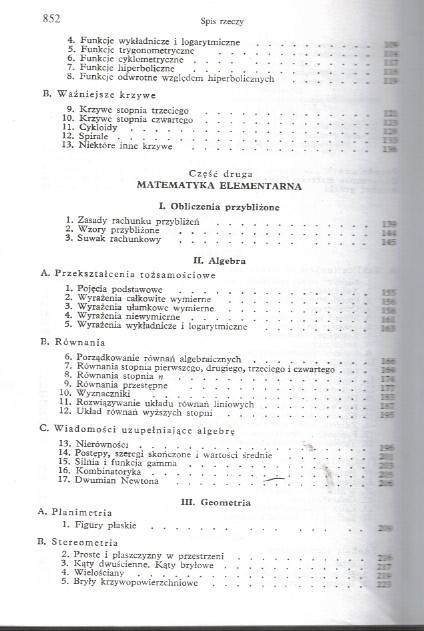 Poradnik zawiera podstawowe wiadomości z różnych działów matematyki: Matematyka elementarna - algebra, geometria i trygonometria: geometria analityczna; geometria różniczkowa; analiza matematyczna, w tym rachunek różniczkowy i całkowy, liczby zespolone, równania różniczkowe i całkowe, szeregi Fouriera, rachunek wektorowy, rachunek wariacyjny i rachunek prawdopodobieństwa. Znajdziemy tu także tablice i wykresy funkcji elementarnych oraz tablice funkcji specjalnych.