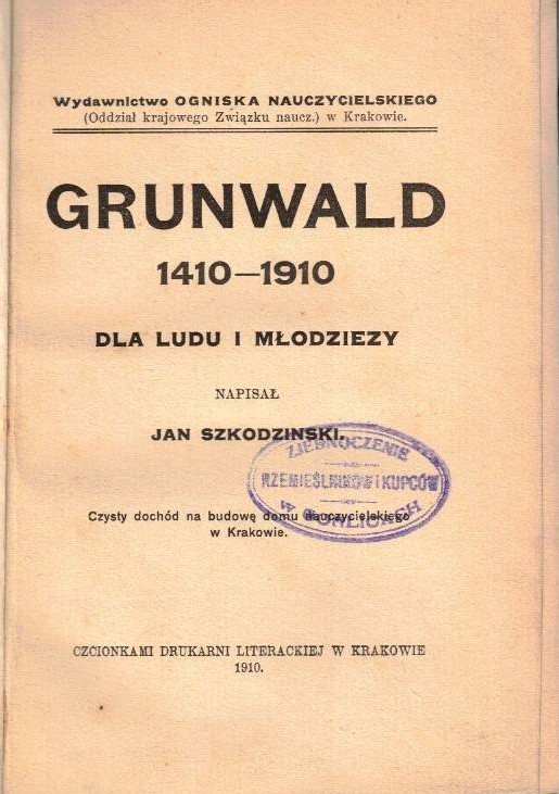 Grunwald 1410-1910 : dla ludu i młodzieży / napisał Jan Szkodziński. - Kraków : [s.n.], 1910 (Czcionkami Drukarni Literackiej). - 63, [1] strona ; 20 cm.