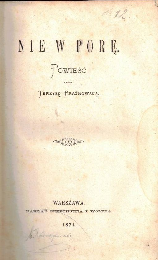 Nie w porę : powieść / przez Teresę Prażmowską. - Warszawa : Gebethner i Wolff, 1871 (Warszawa : Drukarnia "Gazety Polskiej"). - [4], 160 stron ; 23 cm.