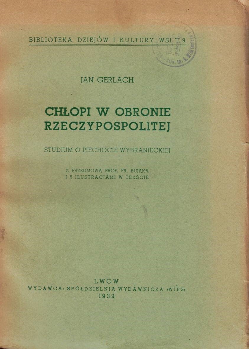 Chłopi w obronie Rzeczypospolitej : studium o piechocie wybranieckiej / Jan Gerlach ; z przedmową Fr. Bujaka. - Lwów : Spółdzielnia Wydawnicza „Wieś", 1939 (Lwów : Drukarnia L. Wiśniewskiego pod zarządem Klemensa Preidla). - 254 stron, 5 kart tablic : ilustracje ; 21 cm.