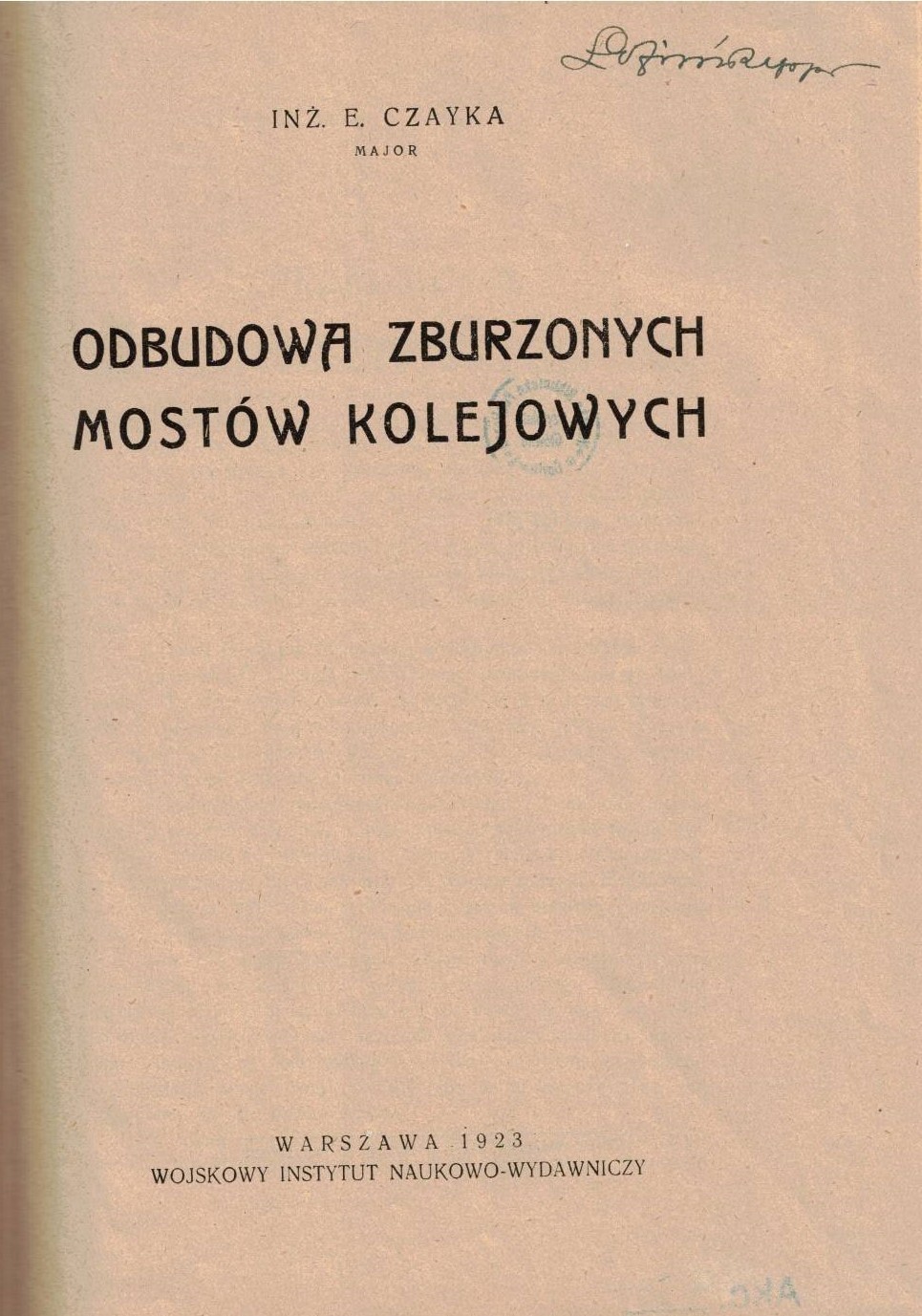 Odbudowa zburzonych mostów kolejowych / E. Czayka. - Warszawa : Wojskowy Instytut Naukowo-Wydawniczy, 1923 (Warszawa : Druk Wacława Maślankiewicza). - 194, IV, [2] s. : ilustracje, tabele ; 25 cm.