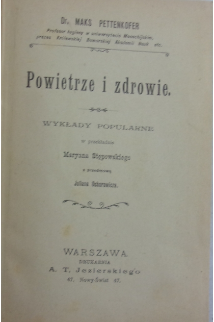 Tyt. okł.: Powietrze i zdrowie : wykłady popularne d-ra Maksa Pettenkofera