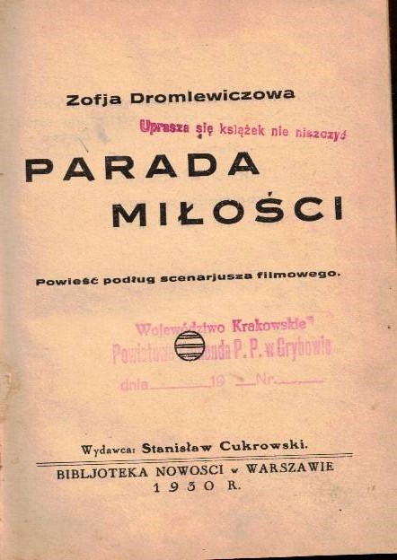 Parada miłości : podług scenariusza filmowego / Zofja Dromlewiczowa. - Warszawa : Stanisław Cukrowski, 1930 (Warszawa : Zakład Graficzny Pracowników Drukarskich). - 143 strony ; 17 cm.
