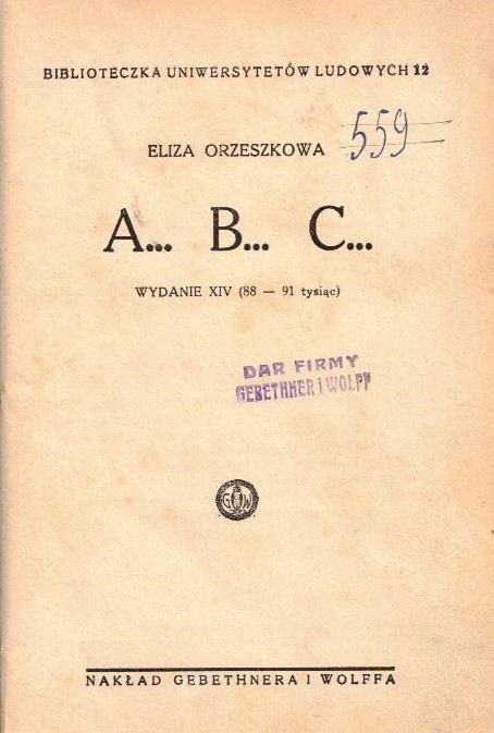 A...B...C... / Eliza Orzeszkowa. - Wydanie XIV (88-91 tysiąc) - [Warszawa] : Gebethner i Wolff, 1938 (Warszawa : "Antiqua"). - 38, [2] strony ; 18 cm.
