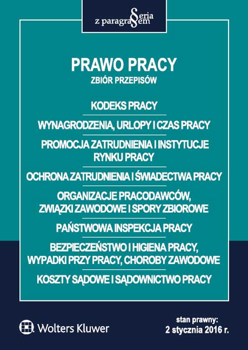 Zbiór uwzględnia zmiany, które zostały opublikowane do dnia 1 września 2016 r. w tym m.in.: kodeks pracy, ustawa o minimalnym wynagrodzeniu za pracę, ustawa o promocji zatrudnienia i instytucjach rynku pracy, ustawa o ochronie roszczeń pracowniczych w razie niewypłacalności pracodawcy, ustawa o rehabilitacji zawodowej i społecznej oraz zatrudnieniu osób niepełnosprawnych, ustawa o Państwowej Inspekcji Pracy, ustawa o ubezpieczeniu społecznym z tytułu wypadków przy pracy i chorób zawodowych, ustawa o kosztach sądowych w sprawach cywilnych, wykaz wszystkich uwzględnionych zmian zamieszczono przed spisem treści. (Z okł.)