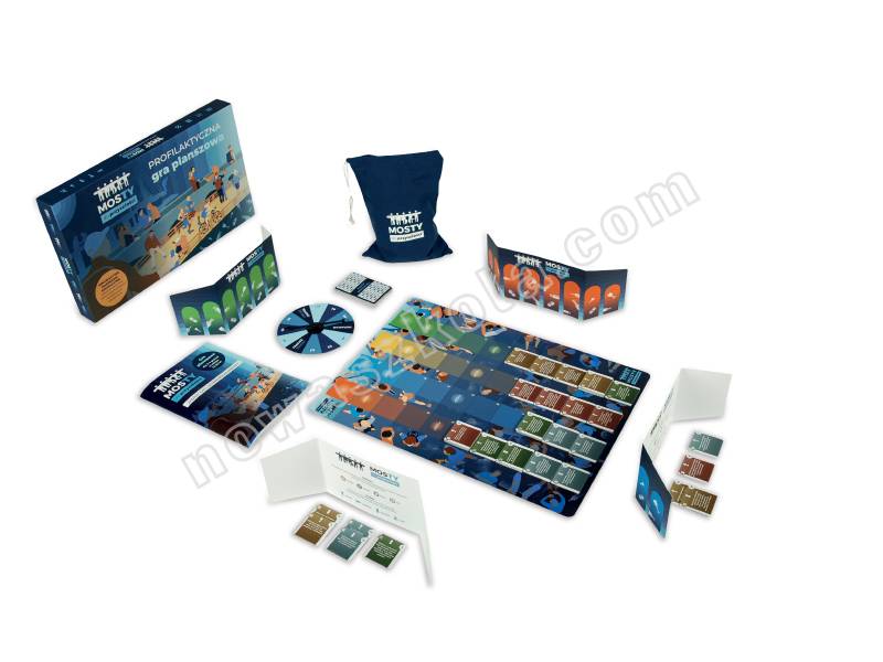 Mosty do przyszłości to wciągająca, strategiczna gra planszowa dla dzieci i młodzieży. Podczas emocjonującej i kszałcącej rozgrywki gracze rywalizuja ze sobą w budowie tytułowych mostów używając do tego specjalnych żetonów, reprezentujacych różne materiały i zawierajacych informacje dotyczace wpływu używek na różne obszary życia. Poruszane są zagadnienia dotyczące bezpośrednio każdego młodego człowieka – zdrowie, życie społeczne, uroda, czy relacje międzyludzkie. Informacje podzielone są na trzy kategorie poświęcone szkodliwości używek: alkohol, papierosy i narkotyki, oraz czwartą poświęconą sportowi i korzyściom, jakie w każdym obszarze życia płyną z aktywności fizycznej. Zwycięzcą gry zostaje ten, który jako pierwszy zbuduje swój most. Aby to zrobić gracze muszą wykazać się umiejętnościa strategicznego myślenia, sprawnie szacować ryzyko i podejmować różnorakie decyzje, dzięki czemu gra jest niezwykle wciągająca i ma funkcję edukacyjną. Dodatkowym elementem zwiększającym dynamikę gry są karty specjalne, których umiejetne użycie może czasem przechylić szale zwycięstwa. Szczegółowe rozwinięcie wszystkich zagadnień, które pojawiają się na żetonach znajduje się w specjalnym, liczącym 56 stron kompendium wiedzy, w którym znaleźć można 80 rzetelnie opracowanych artykułów dla młodego odbiorcy poświęconych każdemu ze wspomnianych zagadnień i które samo w sobie jest prawdziwą skarbnicą wiedzy.
