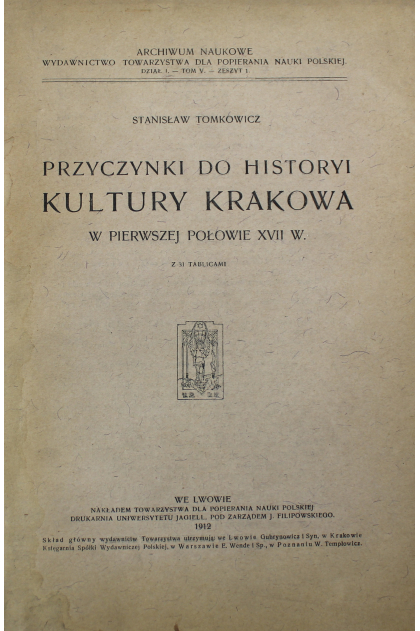Przyczynki do historyi kultury Krakowa w pierwszej połowie XVII wieku / Stanisław Tomkowicz. - Lwów : Towarzystwo dla Popierania Nauki Polskiej, 1912 ([Kraków] : Drukarnia Uniwersytetu Jagiellońskiego pod zarządem J. Filipowskiego). - [3], 315, [1] strona, [31] kart tablic : ilustracje ; 27 cm.