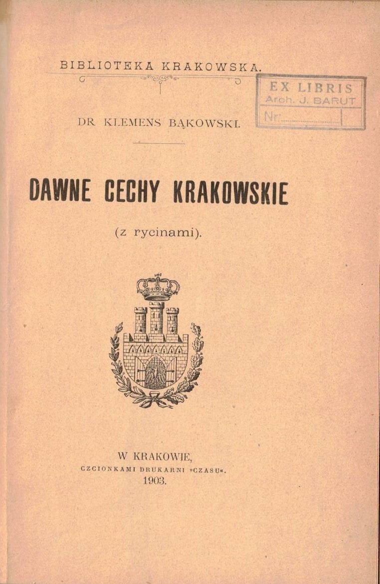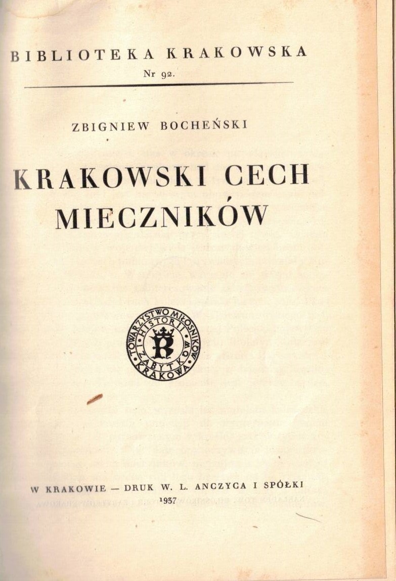 Dawne cechy krakowskie : (z rycinami) / Klemens Bąkowski. Krakowski cech mieczników / Zbigniew Bocheński. - Kraków : Towarzystwo Miłosników Historyi i Zabytków Krakowa, 1903, 1937 (Kraków : Druk. "Czasu") ; (Kraków : W. L. Anczyc). - 153 strony, [8] kart tablic ; 90, [1] strona, [8] stron tablic, [1] karta tablic złożonych : ilustracje ; 21 cm.