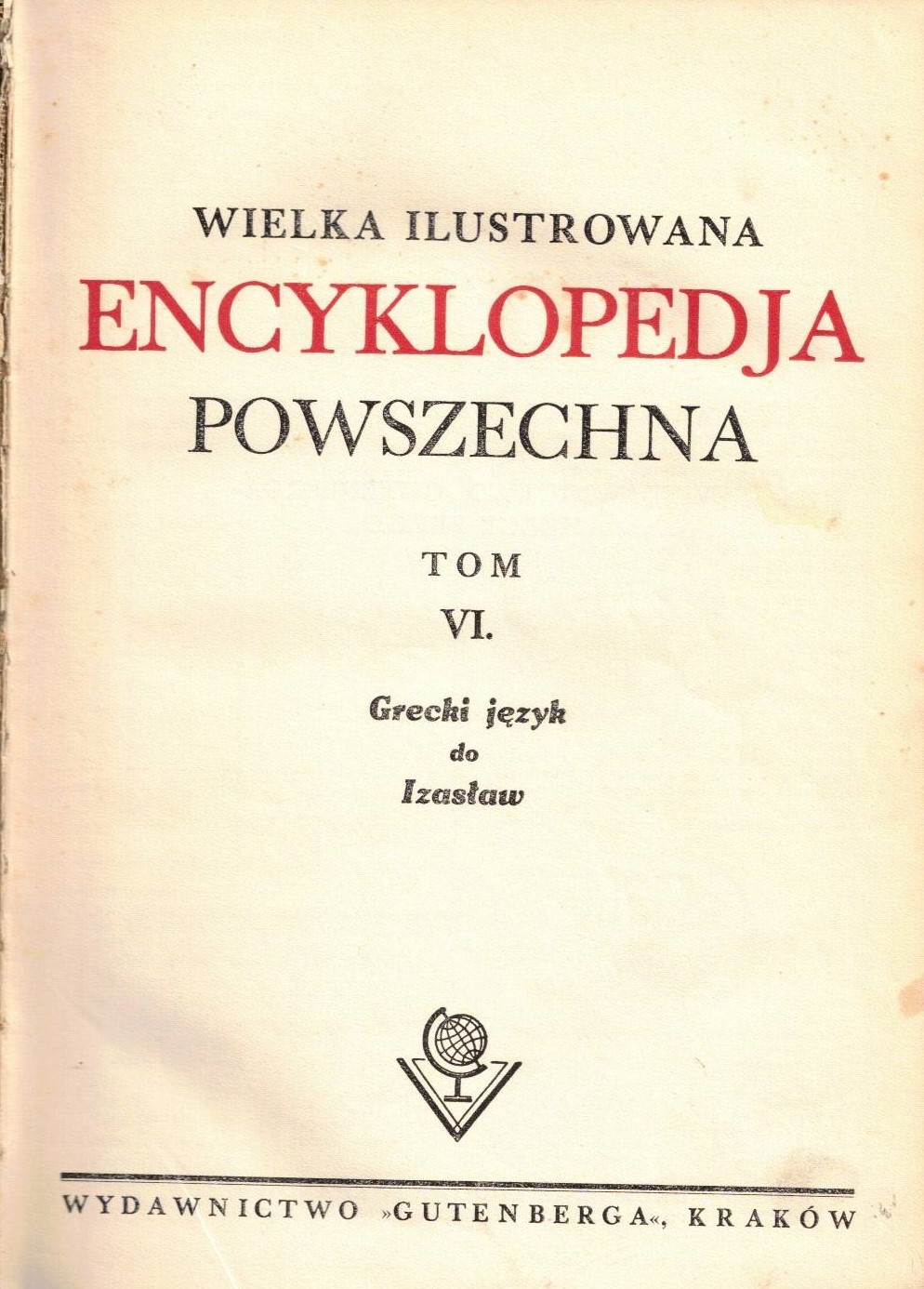 Wielka ilustrowana encyklopedja powszechna. T. 6, Grecki język do Izasław. - Kraków : Wydawnictwo Gutenberga, [1930] (Kraków : Drukarnia Ludowa). - 320 stron, XXIV, [2] sstron tablic, [1] karta tablic : ilustracje, faksymilie, fotografie, mapy, portrety, rysunki ; 25 cm.