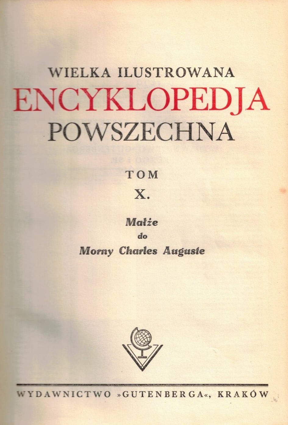 Wielka ilustrowana encyklopedja powszechna. T. 10, Małże do Morny Charles Auguste. - Kraków : Wydawnictwo Gutenberga, [1931] (Kraków : Drukarnia Ludowa). - 320 stron, XXVIII stron tablic : ilustracje, fotografie, mapy, plany, portrety, rysunki, wykresy ; 25 cm.