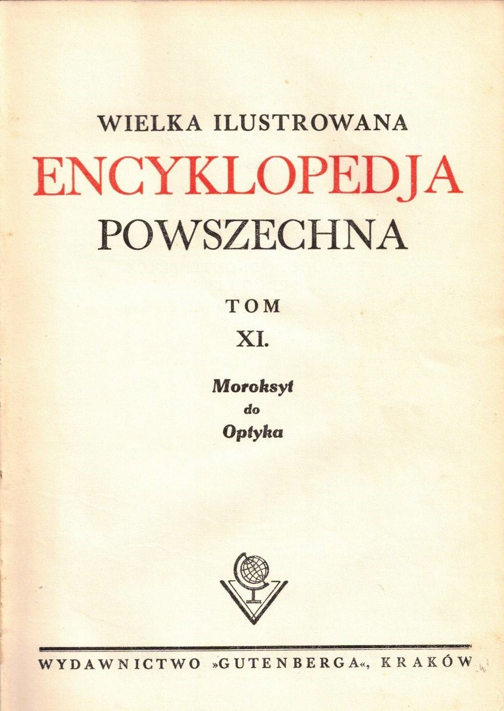 Wielka ilustrowana encyklopedja powszechna. T. 11, Moroksyt do Optyka. - Kraków : Wydawnictwo Gutenberga, [1931] (Kraków : Drukarnia Ludowa). - 320 stron, XX stron tablic, [7] kart tablic : ilustracje, fotografie, mapy, nuty, portrety, rysunki ; 25 cm.