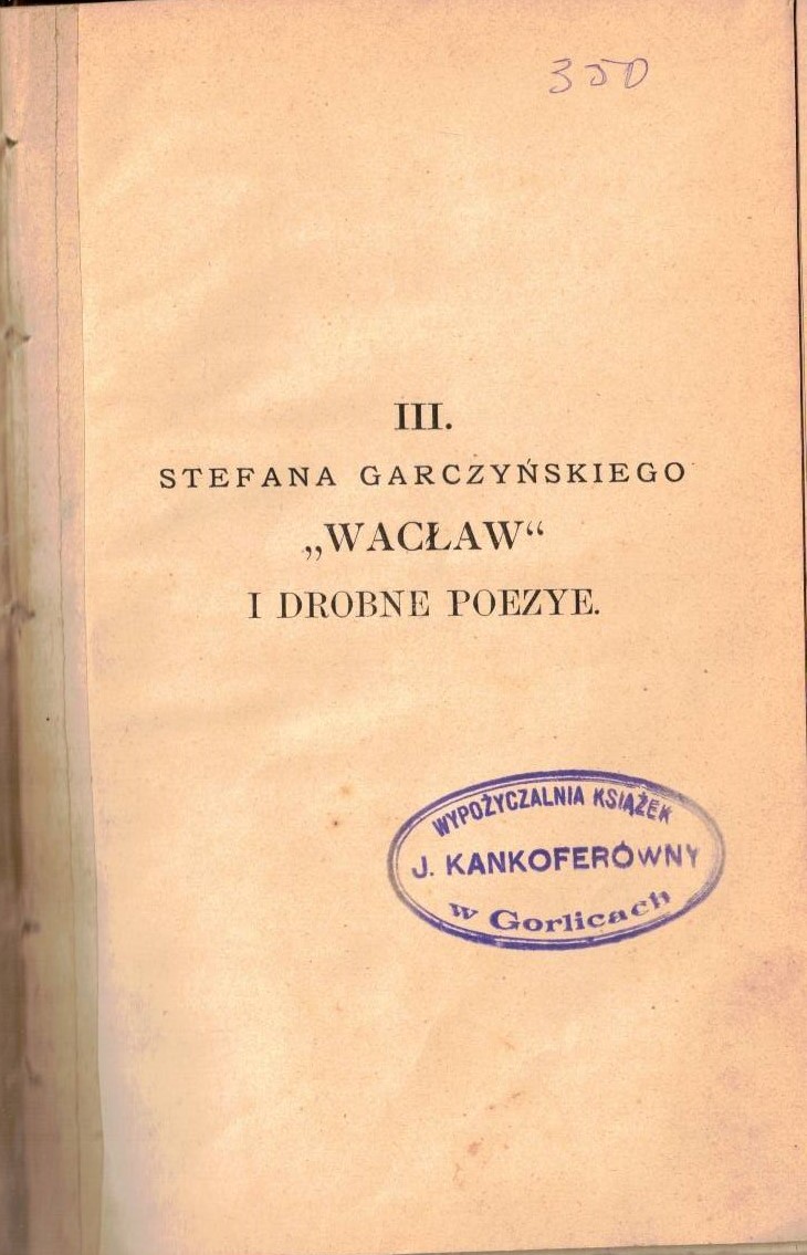 Stefana Garczyńskiego "Wacław" i drobne poezye / St. Tarnowski. - Kraków : Spółka Wydawnicza Polska, 1896 (Kraków : w Drukarni "Czasu" Franciszka Kluczyckiego i Sp. pod zarządem Józefa Łakocińskiego). - Strony [3], 174-224 ; 20 cm.