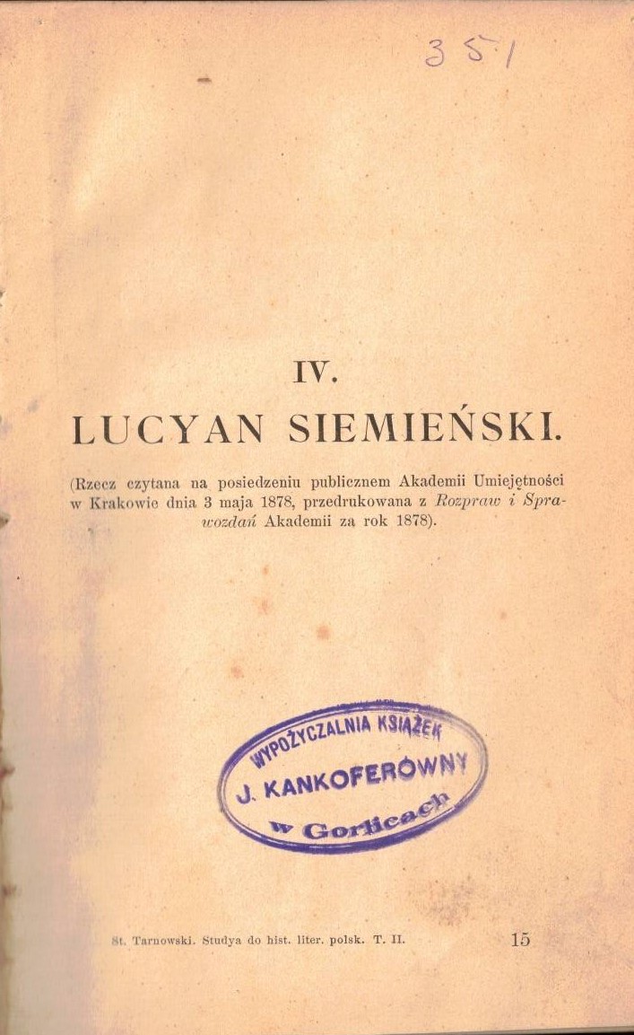 Lucyan Siemieński / St. Tarnowski. - Kraków : Spółka Wydawnicza Polska, 1896 (Kraków : w Drukarni "Czasu" Franciszka Kluczyckiego i Sp. pod zarządem Józefa Łakocińskiego). - Strony [3], 228-290 ; 20 cm.