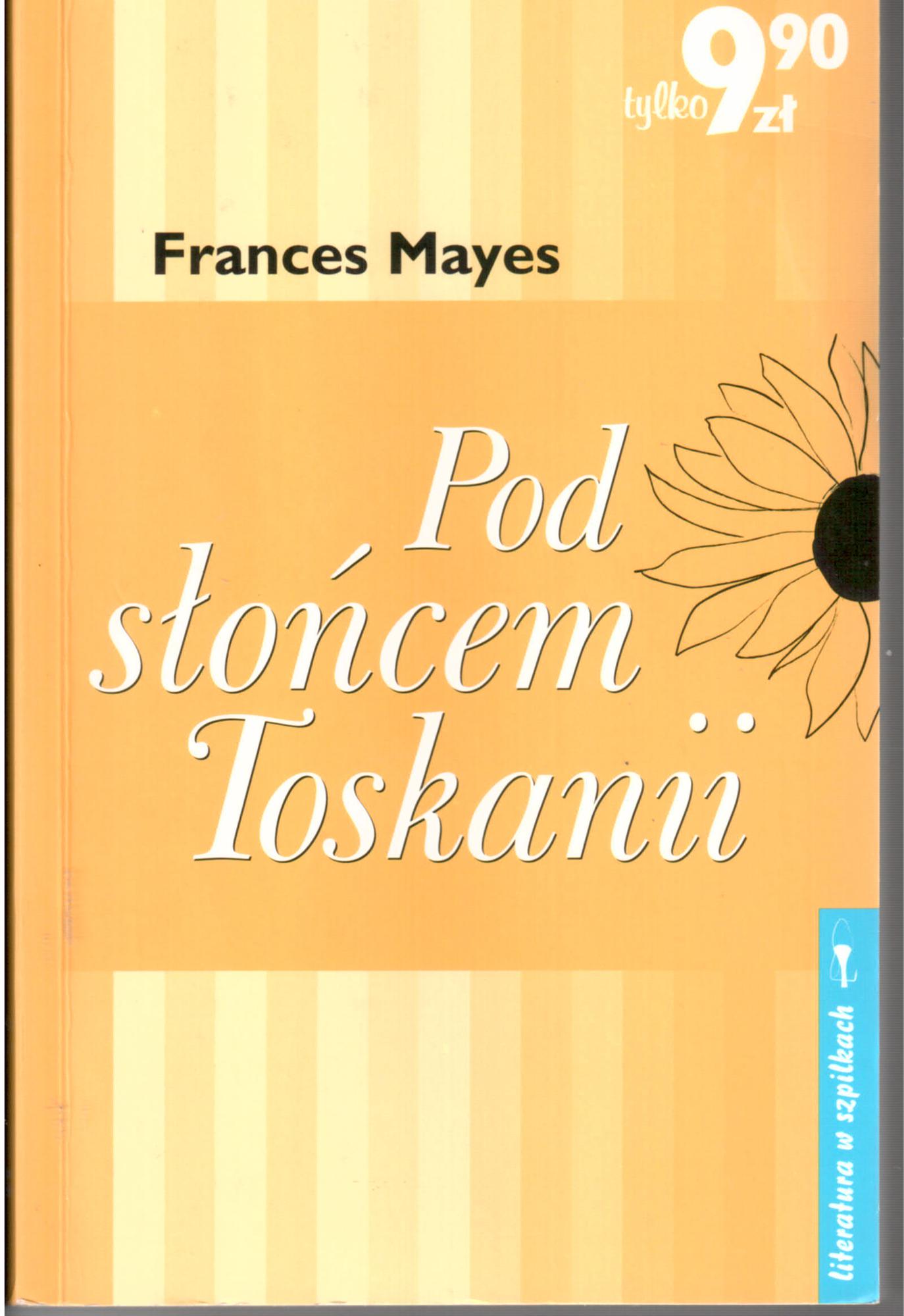Pisarka po rozwodzie przeżywa kryzys twórczy i emocjonalny. Za namową przyjaciółki wyjeżdza odpocząć do Toskanii. Na miejscu pod wpływem nagłego impulsu kupuje malowniczo położony stary dom na wsi, a w jego remont i urządzanie wkłada całe serce. Rozkoszuje się urodą romantycznych zakątków Włoch, spokojnym stylem życia oraz smakiem potraw. W końcu Frances znajduje nie tylko ukojenie, ale także przyjażń i miłość. "Pod słońcem Toskanii" to niezwykle ciepła i pogodna autobiograficzna powieść Frances Mayes. Krytycy pisali, że otwierając tą książkę, można niemal poczuć smak suszonych pomidorów i zapach delikatnego włoskiego wina. (Rec. wydaw.)