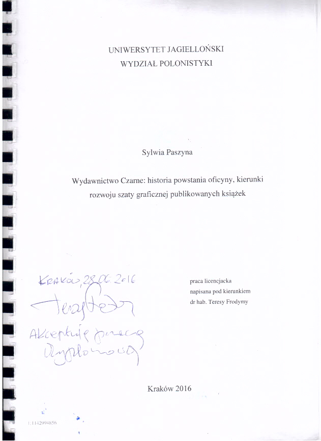 ...W niniejszej pracy zajmę się opisaniem rozwoju strony wizualnej publikacji Czarnego poprzez zarysowanie sylwetek grafików pracujących nad oprawą graficzną wydawanych książek. Ze wzgledu na wspomniany brak materiałów bibliograficznych, będę bazować na rozmowach przeprowadzonych z twórcami okładek i ilustracji oraz innymi współpracownikami Czarnego, wywiadach i artykułach prasowych dostępnych w sieci, a także na własnej analizie materiałów. Proponuję chronologiczny porządek omawiania sylwetek artystów: w zależności od czasu rozpoczęcia współpracy z wydawnictwem. (Ze wstępu)