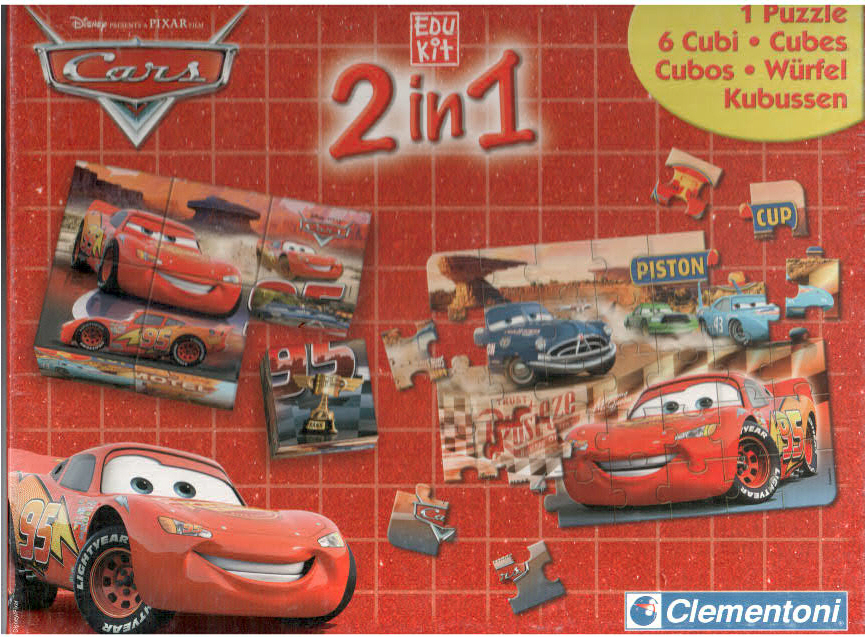 Cars : Edu Kit 2 in 1 : 1 Puzzle, 6 Cubi, Cubes Cubos, Würfel Kubussen. - Fontenoce (Włochy) : Clementoni, 200?. - 35 sztuk puzzli, 6 klocków : ilustracje ; pudełko 23x29x5 cm.
