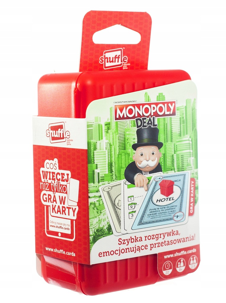 Gra Monopoly Deal polega na gromadzeniu działek i podkradaniu ich przeciwnikom! Używaj kart akcji, by pobierać opłaty za czynsz, wymieniać karty, zażyczyć sobie pieniędzy z okazji urodzin i wiele więcej. Wkładaj duże sumy do swojego banku - i pamiętaj, że inni gracze też będą zabierać Tobie!