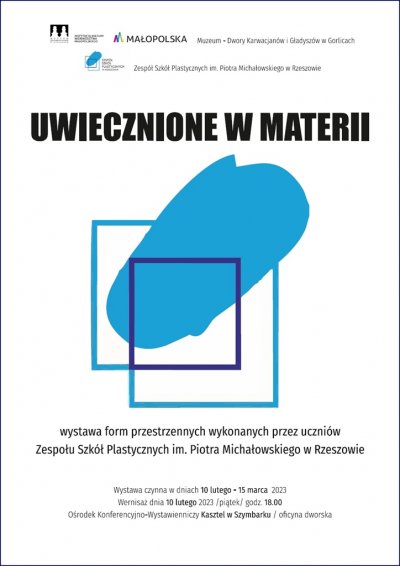 Plakat informujący o wystawie form przestrzennych wykonanych przez uczniów Zespołu Szkół Plastycznych w Rzeszowie, która miała miejsce w Ośrodku Konferencyjno-Wystawienniczym w Szymbarku w dniach od 10 lutego do 15 marca 2023 roku.