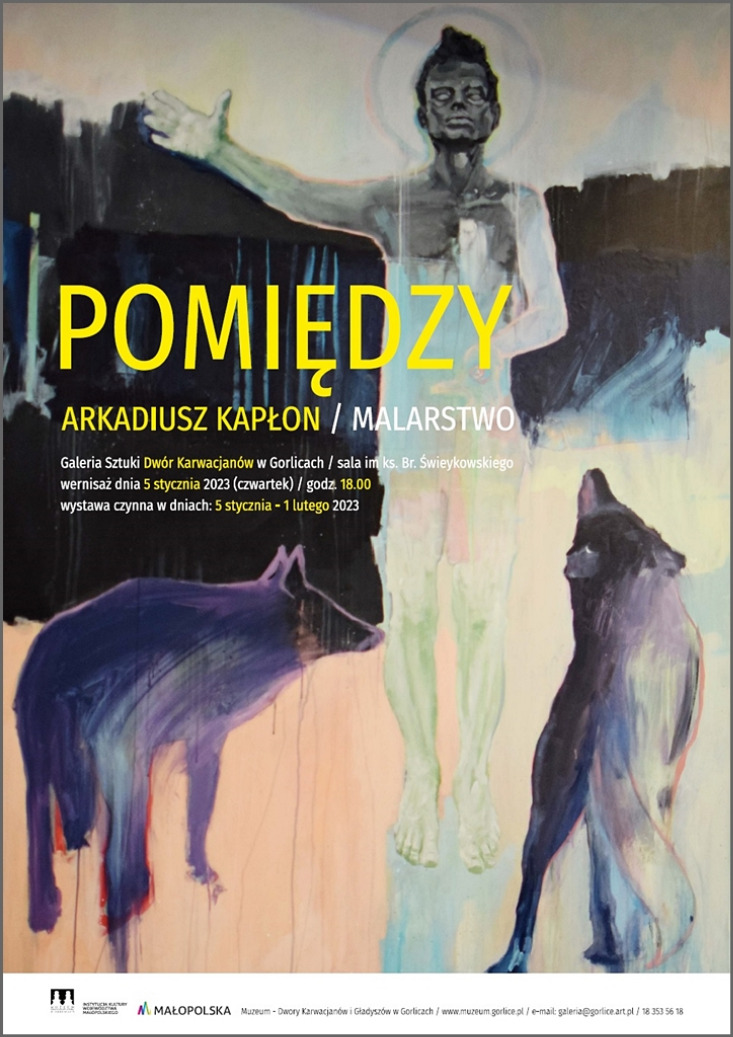 Plakat informujący o wystawie malarstwa Arkadiusza Kapłona "Pomiędzy", która odbyła się w Muzeum Dwory Karwacjanów i Gładyszów w Gorlicach w dniach od 5 stycznia do 1 lutego 2023 roku.