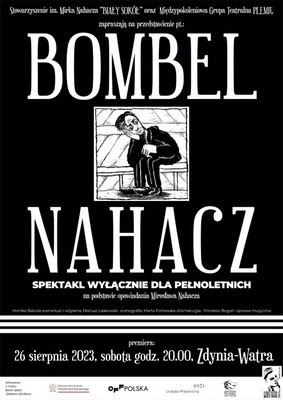 Plakat informujący o spektaklu teatranym "Bombel - Nahacz", który odbył się 27 sierpnia, 2-10 września 2023 roku w Zdyni.