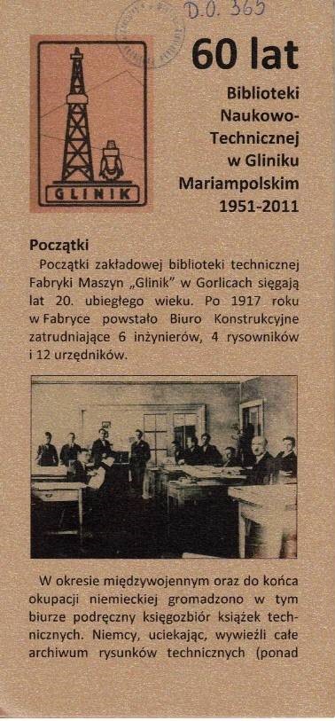 Początki zakładowej biblioteki technicznej Fabryki Maszyn "Glinik" w Gorlicach sięgają lat 20 ubiegłego wieku. Po 1917 roku w Fabryce powstało Biuro Konstrukcyjne zatrudniające 6 inżynierów, 4 rysowników i 12 urzędników.... (Fragment tekstu)