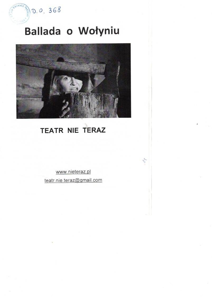 "Ballada o Wołyniu" to pierwszy w Polsce teatrany spektakl sceniczny, który opowiada o ludobójstwie na polskiej ludności Kresów Wschodnich w latach II wojny światowej, popełnionym przez nacjonalistów ukraińskich... (FRagment tekstu)