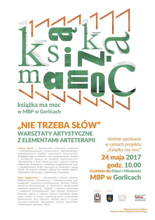 Plakat informujący o wasztatach artystycznych "Nie trzeba słów" zorganizowanych 24 maja 2017 roku w ramach projektu "Książka ma moc" przez Miejską Bibliotekę Publiczną w Gorlicach w 2017 roku.