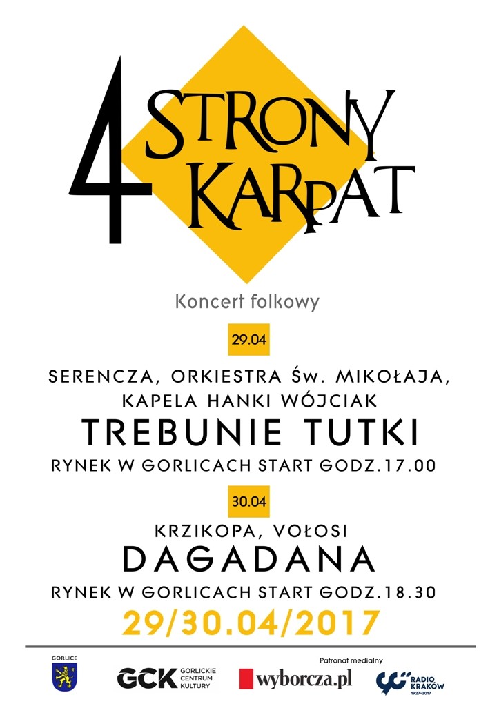 Plakat informujący o koncercie folkowym, który odbył się w dniach 29-30 kwietnia 2017 roku. W koncercie udział wzięli: Serencza, Orkiestra Św. Mikołaja, Kapela Hanki Wójciak Trebunie Tutki, Krzikopa, Vołosi Dagadana.