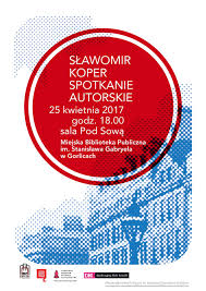 Plakat informujący o spotkanie autorskim z Sławomirem Koperem, które odbyło się 1 czerwca 2017 roku w Miejskiej Bibliotece Publicznej w Gorlicach.