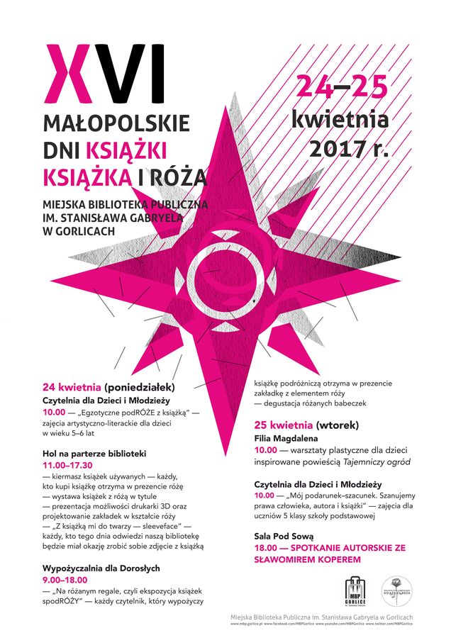 Plakat informujący o XVI Małopolskich Dniach Książki "Książka i Róża", jakie odbyły się w Miejskiej Bibliotece Publicznej w Gorlicach w dniach 24-25 kwietnia 2017 roku.
