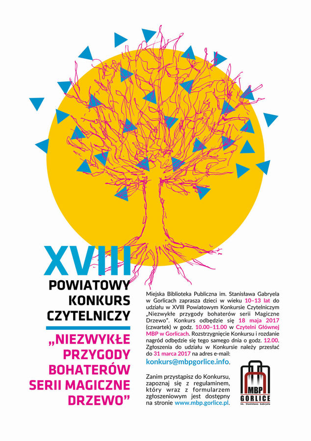 Plakat informujący o XVIII Powiatowym Konkursie Czytelniczym "Niezwykłe przygody bohaterów serii magiczne drzewo", który odbył się 31 marca 2017 roku w Miejskiej Bibliotece Publicznej w Gorlicach.