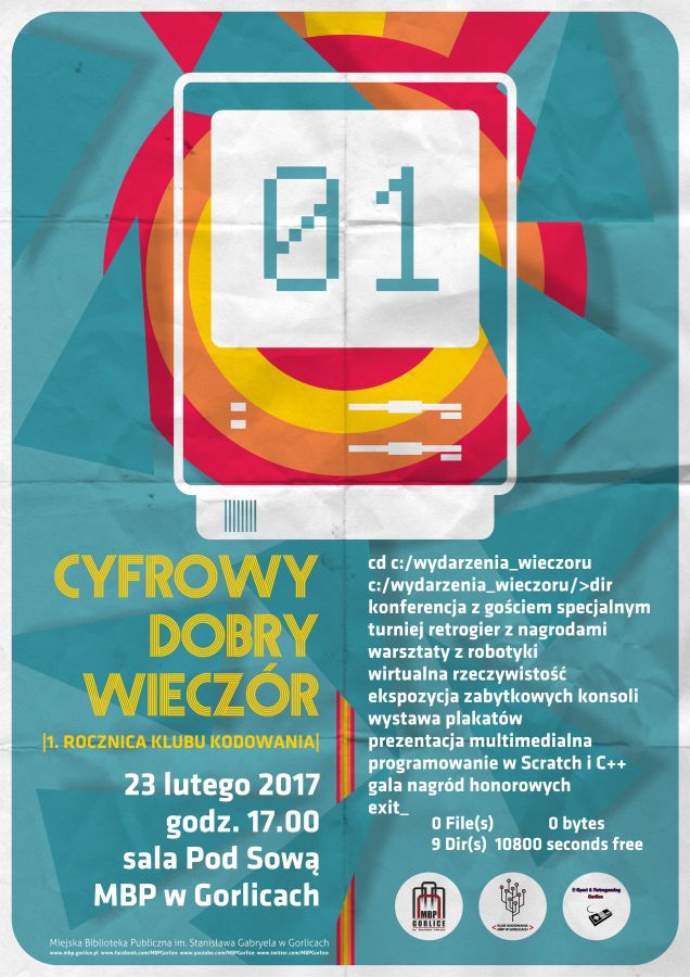 Plakat informujący o spotkaniu "Cyfrowy Dobry Wieczór" jaki odbył się 23 lutego 2017 roku w Miejskiej Bibliotece Publicznej w Gorlicach.