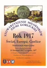 Plakat informujący o konferencji historycznej "Rok 1917 Świat, Europa, Gorlice", jaka odbyła się 21 listopada 2017 roku w Zespole Szkół Zawodowych w Gorlicach. Organizatorem konferencji było Stowarzyszenie Miłośników Ziemi Gorlickiej.
