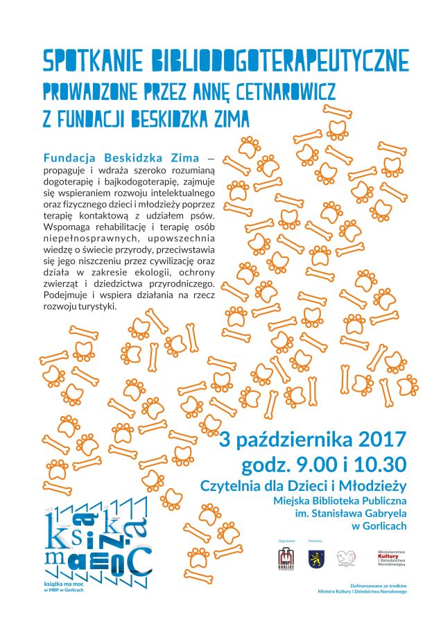 Plakat informujący o spotkaniu bibliodogoterapeutycznym prowadzonym przez Annę Cetnarowicz, które odbyło się 3 października 2017 roku w Miejskiej Bibliotece Publicznej w Gorlicach w ramach projektu "Książka ma moc'.