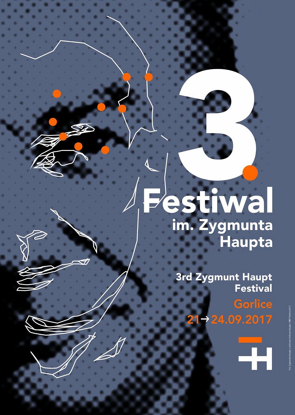 Plakat informujący o 3 festiwalu im. Zygmunta Haupta, który odbył się w dniach od 21 do 24 września 2017 roku w Miejskiej Bibliotece Publicznej w Gorlicach.
