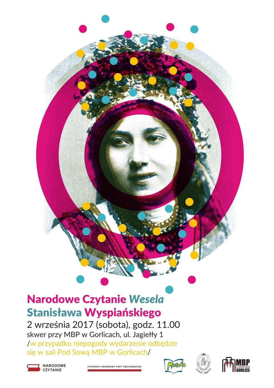 Plakat informujący o akcji narodowego czytania Wesela Stanisława Wyspiańskiego, które odbyło się 2 września 2017 roku w Miejskiej Bibliotece Publicznej w Gorlicach.