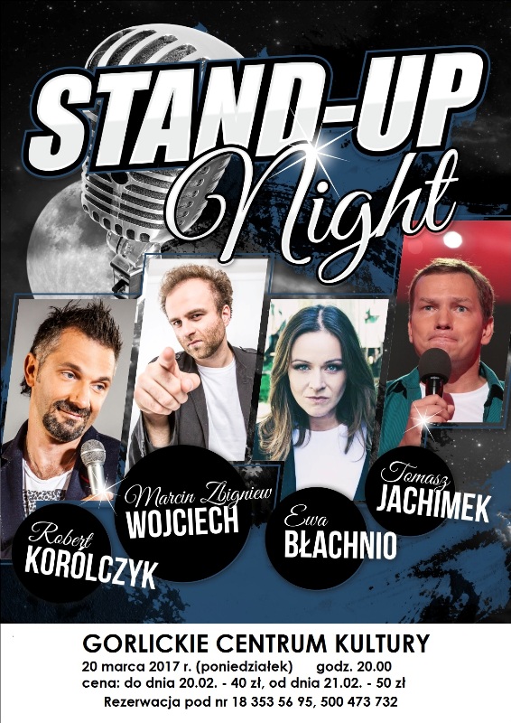 Plakat informujący o występie kabaretowym zatytułowanym „Stand-Up Night”, jaki odbył się 20 marca 2017 roku w Gorlickim Centrum Kultury.