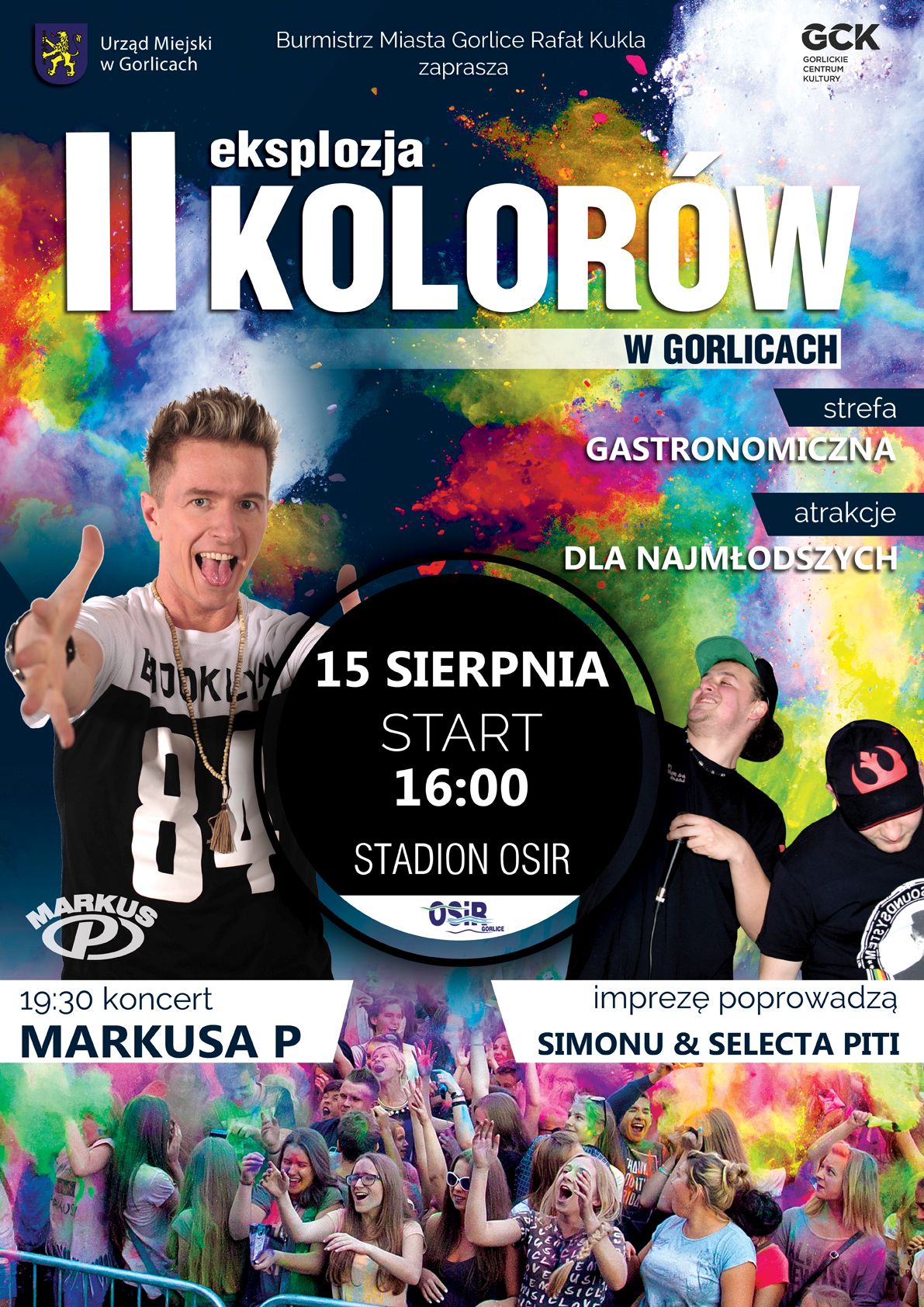 Plakat informujący o II eksplozji kolorów w Gorlicach, która odbyła się 15 sierpnia 2017 na stadionie OSIR w Gorlicach.