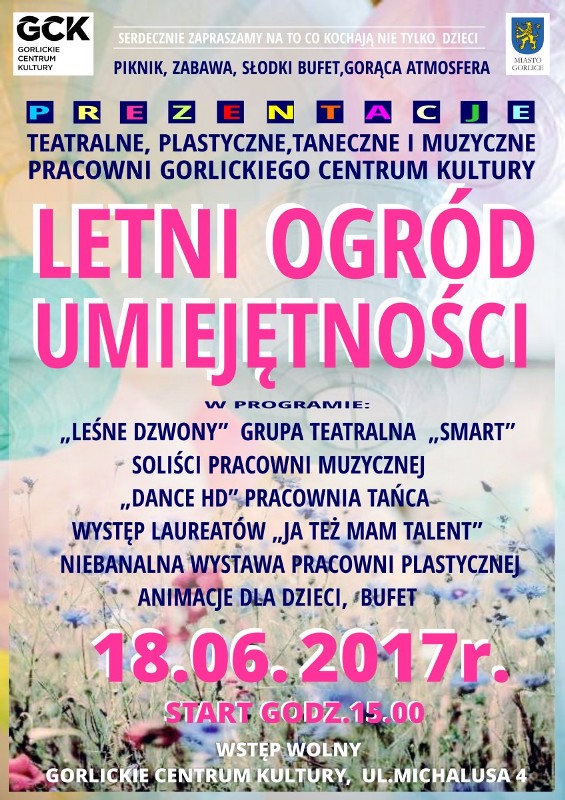 Plakat informujący o prezentacji teatralnej, plastycznej, tanecznej i muzycznej pracowni Gorlickiego Centrum Kultury pod hasłem " Letni ogród umiejętności", jaka odbyła się 18 czerwca 2017 roku w Gorlickim Centrum Kultury.