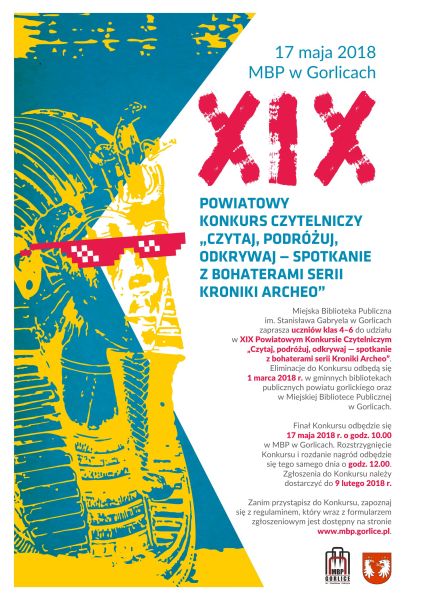 Plakat informujący o XIX Powiatowym Konkursie Czytelniczym "Czytaj, podróżuj, odkrywaj - spotkanie z bohaterami serii Kroniki Archeo". Finał odbył się 17 maja 2018 roku w Miejskiej Bibliotece Publicznej w Gorlicach.