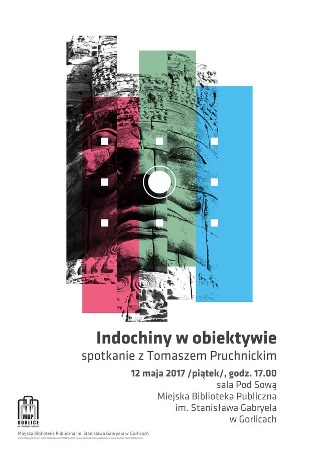 Plakat informujący o spotkaniu z Tomaszem Pruchnickim "Indochiny w obiektywie", które odbyło się 12 maja 2017 roku w Miejskiej Bibliotece Publicznej w Gorlicach.
