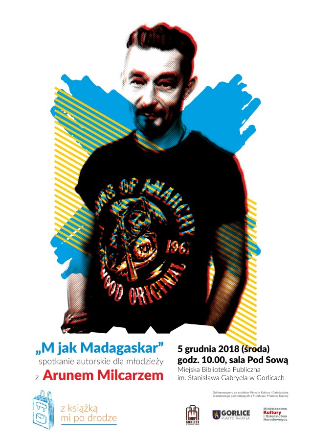 Plakat informujący o spotkaniu autorskim z Arunem Milcarzem, które odbyło się 5 grudnia 2018 roku w Miejskiej Bibliotece Publicznej w Gorlicach.