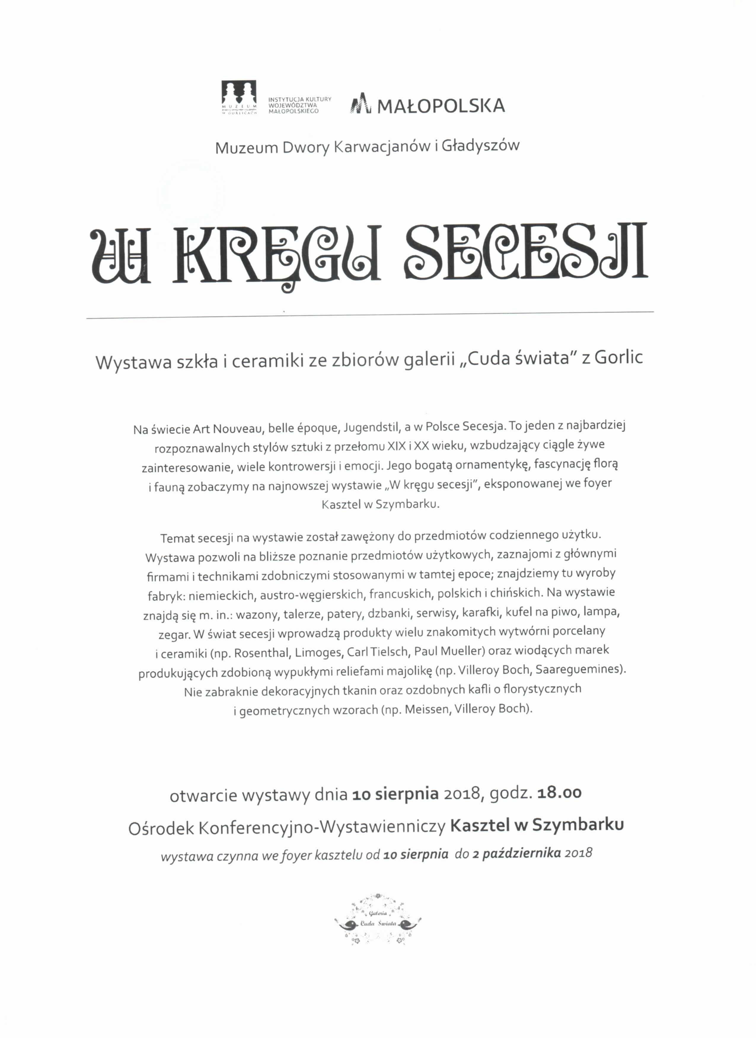 Plakat informujący o wystawie szkła i ceramiki ze zbiorów galerii "Cuda świata" z Gorlic, która odbyła się w dniach od 10 sierpnia do 2 października 2018 roku w Ośrodku Konferencyjno-Wystawienniczym Kasztel w Szymbarku.