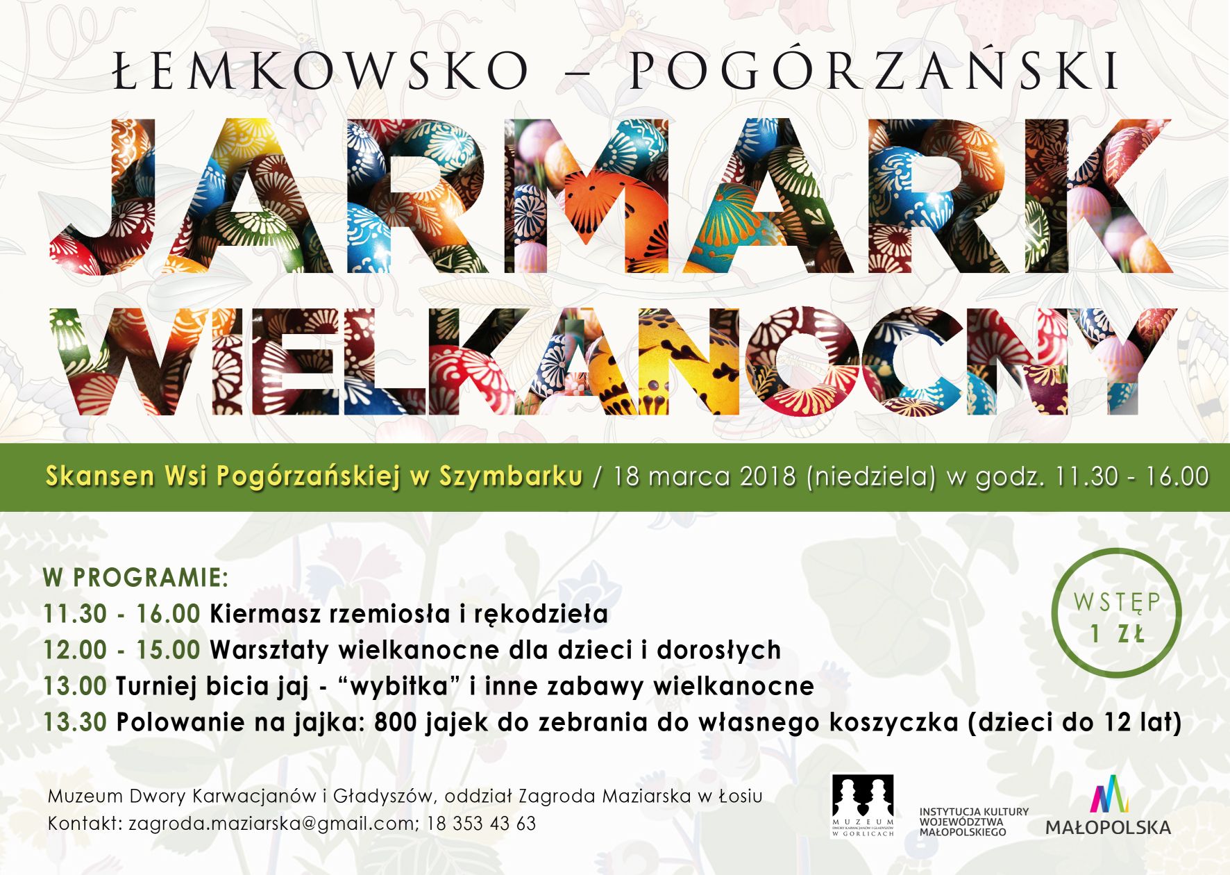 Plakat informujący o Łemkowsko-Pogórzańskim Jarmarku Wielkanocnym, który odbył się 18 marca 2018 roku w Skansenie Wsi Pogórzańskiej w Szymbarku.