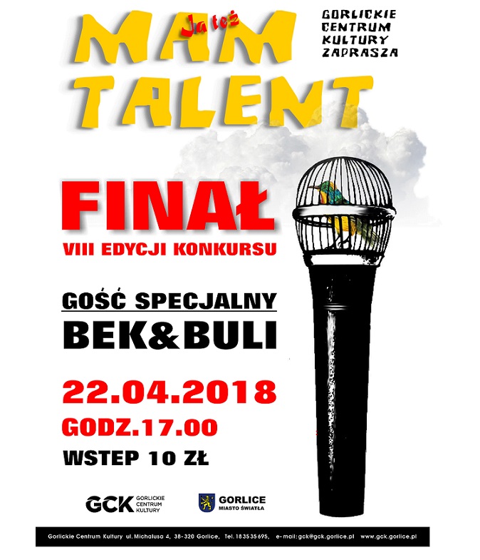 Plakat informujący o finale VIII edycji konkursu "Ja też mam talent", który odbył się 22 kwietnia 2018 roku w Gorlickim Centrum Kultury.