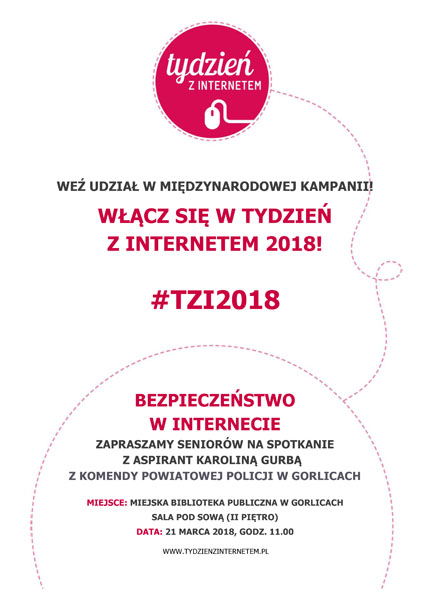 Plakat informujący o udziale w międzynarodowej kampanii "Tydzień z internetem", która odbyła się 21 marca 2018 roku w Miejskiej Bibliotece Publicznej w Gorlicach.